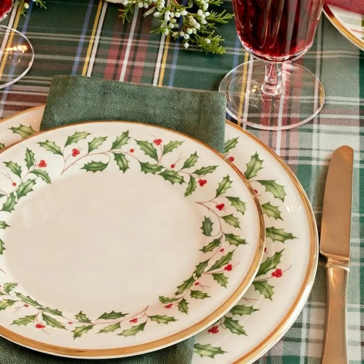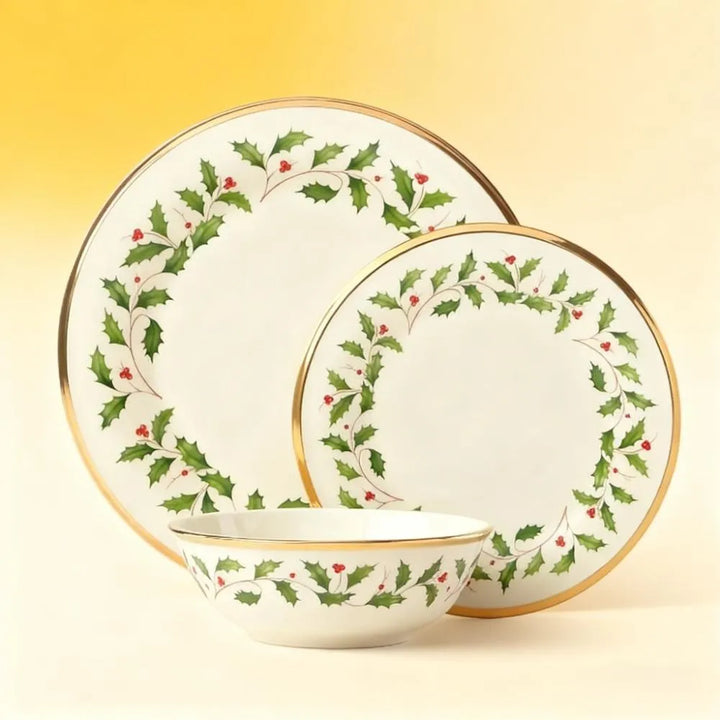 Belonging to the classic Holiday Dinnerware Collection, this 3-piece set showcases a holly-and-berry pattern. Made of porcelain with a luxurious 24-karat gold border, it delivers an opulent, festive vibe—perfect for elevating your holiday meals.