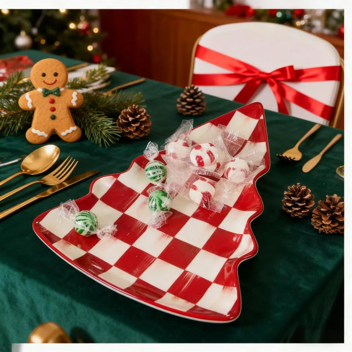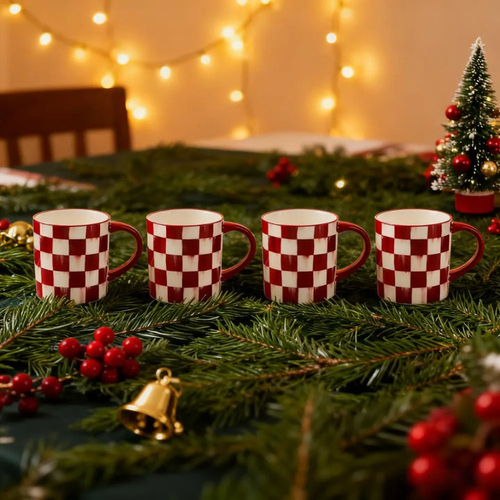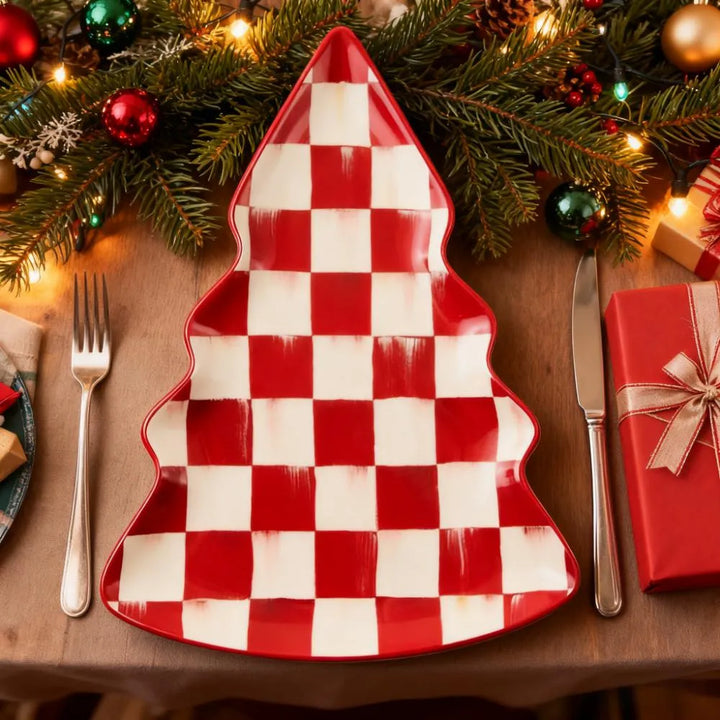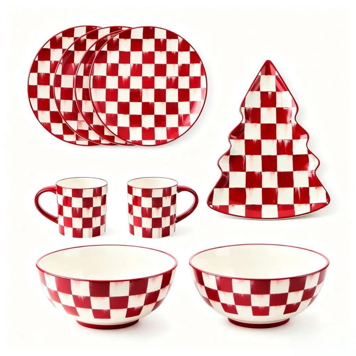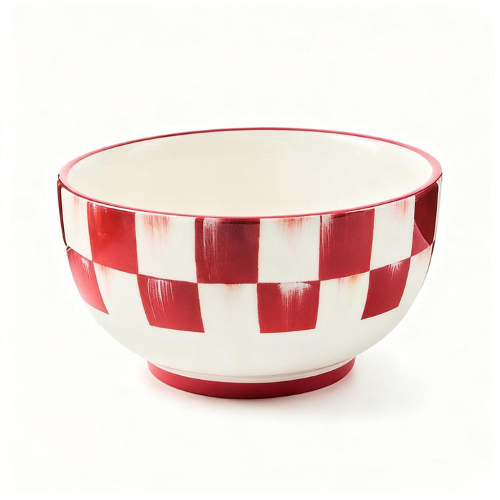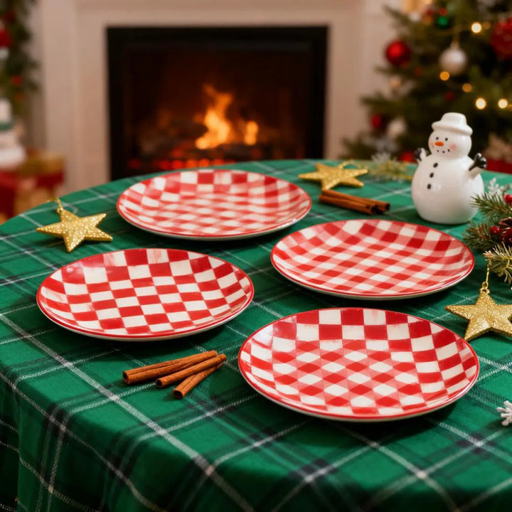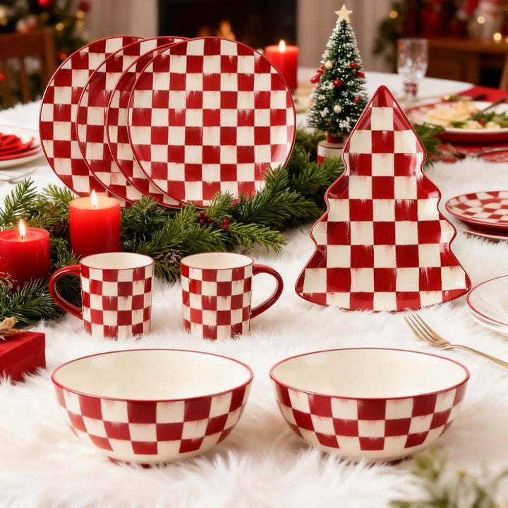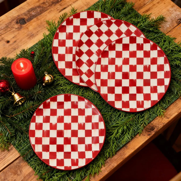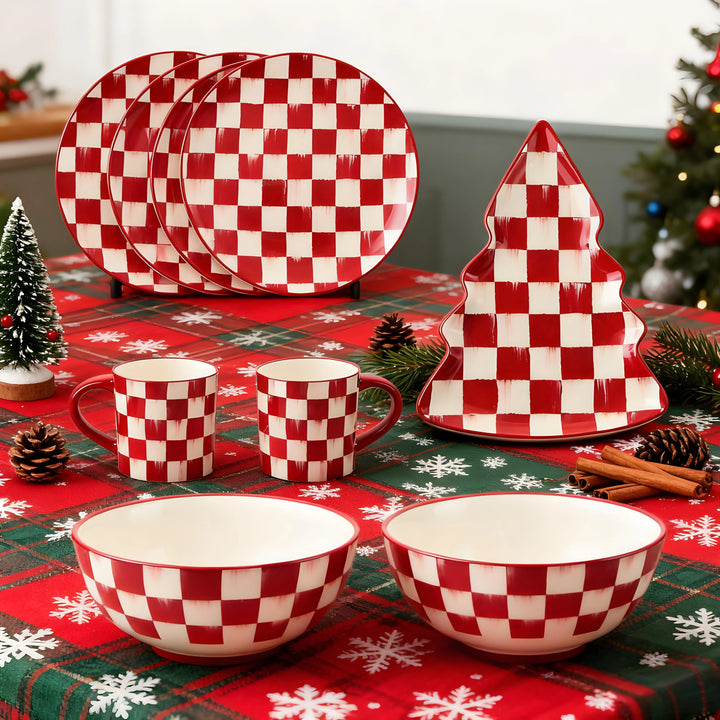 These cherry-check dinner plates infuse your table with cheerful holiday charm. Made for everyday meals, they’re crafted from durable stoneware—dishwasher and microwave-safe for stress-free cleanup. Mix with other cherry-check stoneware pieces or use solo to craft a unique, festive dining spread.
